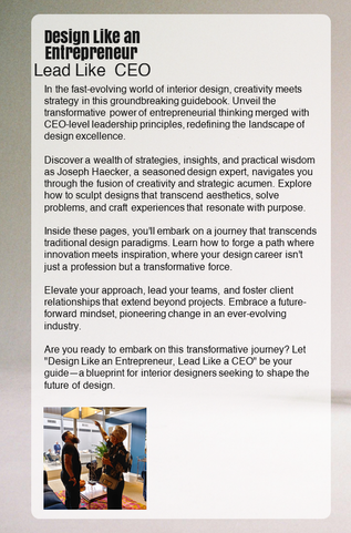 "Design Like an Entrepreneur, Lead Like a CEO: Transformative Strategies for Interior Designers" is a pioneering guidebook that merges entrepreneurial thinking with CEO-level leadership principles, redefining the boundaries of interior design excellence.